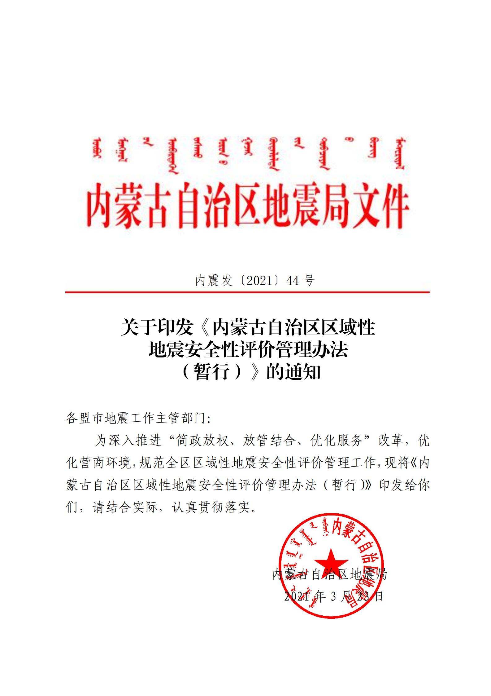 关于印发《内蒙古自治区区域性地震安全性评价管理办法(暂行)》的通知